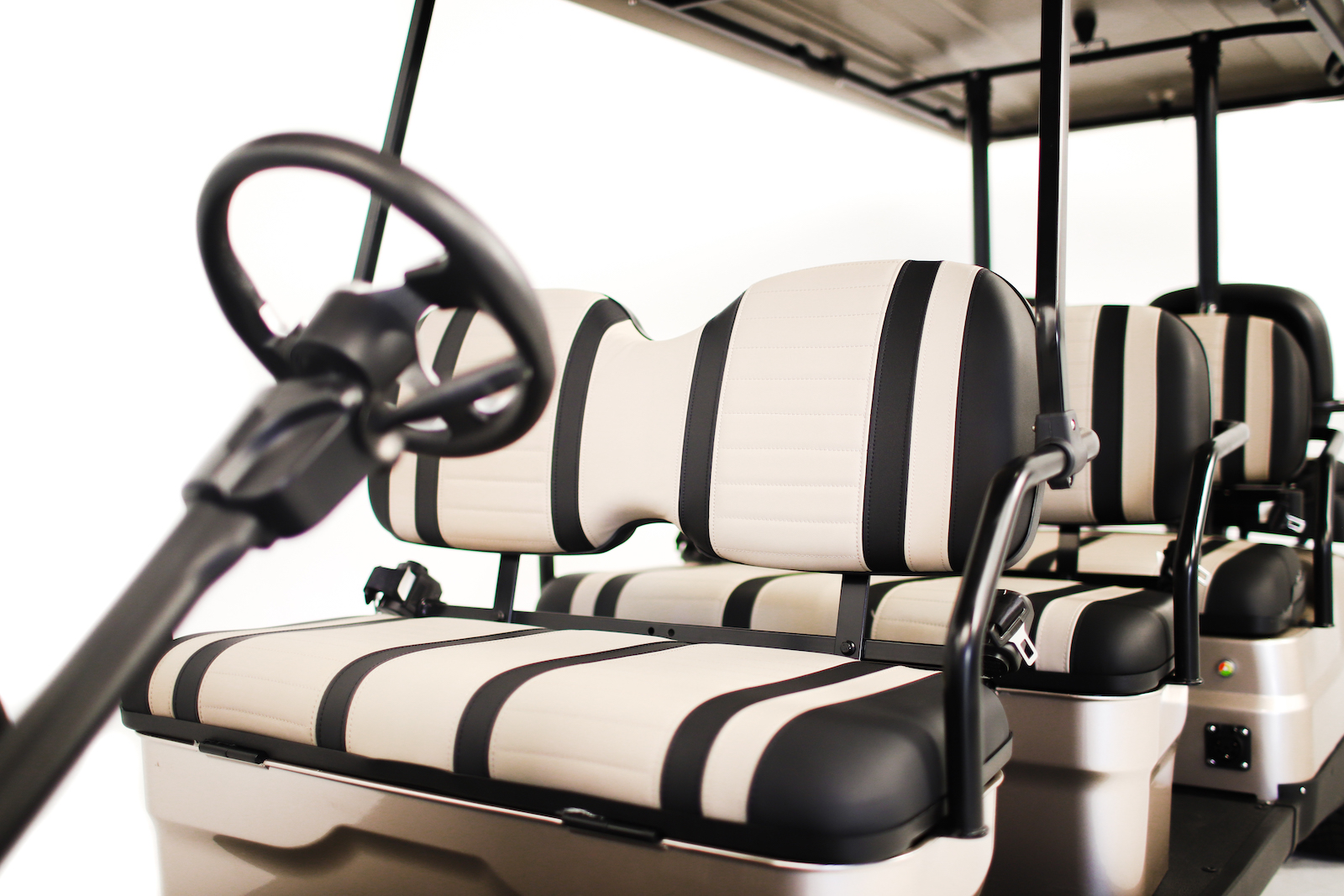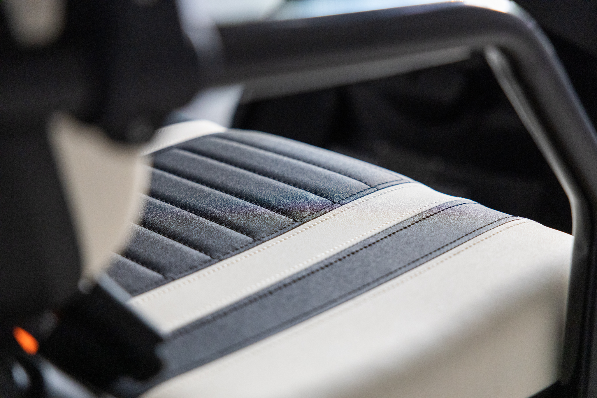 - Seats:Â Marine Grade Vinyl, Custom Stitched Panel, Single Color, Color Matched with White or Black Accents. Fold Flat Rear Seat for Hauling.